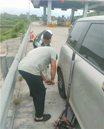 近日,一辆灰色小型客车停靠在曲阳收费站收费外广场,当班班长安术伟见状,立即上前询问。司机面露焦急:“轮胎突然没气了,怕危险,就近驶出高速了。”安术伟一边安慰,一边通过对讲机呼叫收费员陈康,准备备用修车工具,联系与曲阳收费站合作的京航汽车销售有限公司,同时引导车辆移至安全区域,设置警示标志。